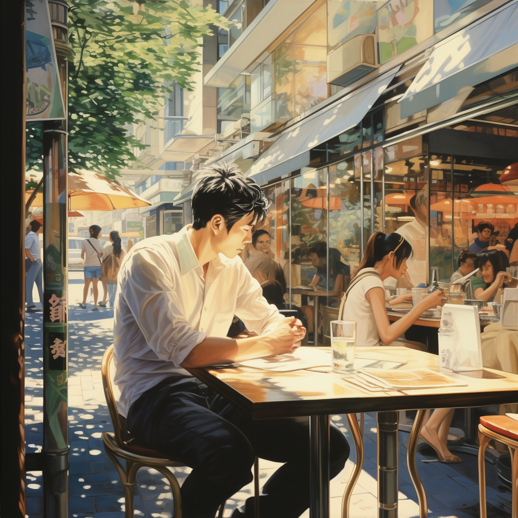 カフェで男性が何か考え事をしています。絵的にはいいですが、構想と合わなかったのでボツ。あと日本ではなくてアジアっぽさが少しありますね。